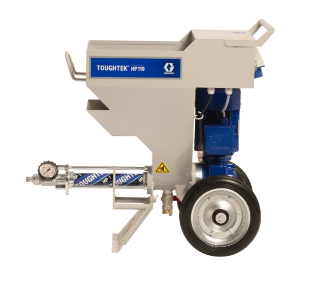 Die neue Graco ToughTek HP110, ein Airless-Rotor-Stator-System zum Auftragen von vorgemischter Spachtelmasse für dünnschichtige Verputze auf Ziegel-, Beton- oder Trockenbauoberflächen.